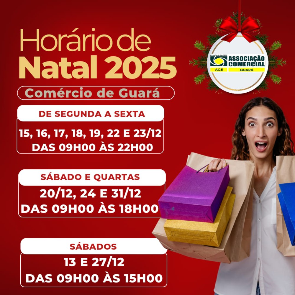 A Associação Comercial e Empresarial de Guará divulgou horários especiais de funcionamento do comércio local, proposto para o mês de dezembro de 2025, proporcionando aos moradores, consumidores e visitantes uma experiência de compras com facilidade e muita festa!